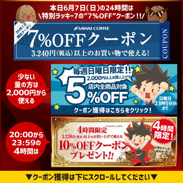 6月7日(日)の24時間は \特別ラッキー7の7%OFFクーポン!!/ 7の付く日の0時から澤井珈琲の全商品で使える7%OFFクーポン発行中!【クーポン獲得はこちらから】 少ない量の方は2,000円から使える \特別5%OFFクーポン!!/ 日曜日の0時から24時間限定で澤井珈琲の全商品で使える5%OFFクーポン発行中!【クーポン獲得はこちらから】 20:00から23:59の4時間は \特別10%OFFクーポン!!/ 20時から4時間限定で澤井珈琲の全商品で使える10%OFFクーポン発行中!【クーポン獲得はこちらから】 エントリーはコチラ!!▼ ▼ ▼ ▼ ▼ 返品につきましては、必ずこちらをご確認下さいませ
